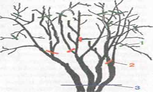 Цифрами обозначены: 3 — обрезка для омоложения растения, 2 — обрезка загущающих побегов, 1 — удаление сухих верхушек.
